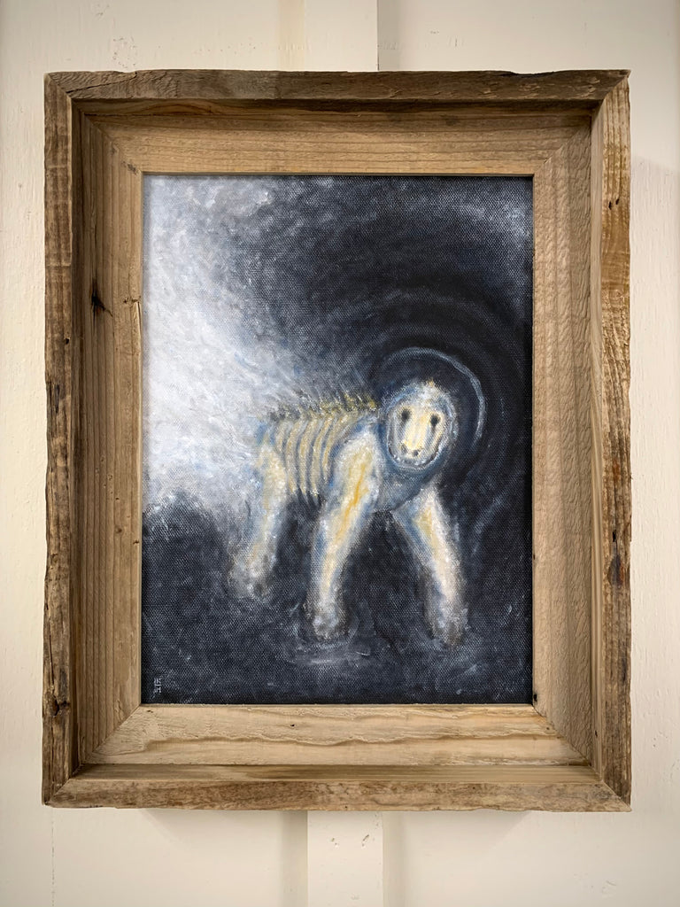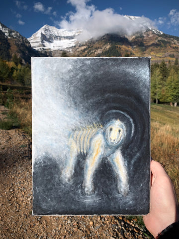 October is my favorite month of the year and I always make sure to set aside time to work on a special painting. This piece has come at a pivotal moment, signifying a lot of shift, self improvement, and strengthening. My creatures represent a lot; from grand abstract themes of existence beyond our understanding and secrets of the unknown universe, to personal extensions of my own feelings, fears, comforts. This guy came at a time when I really needed him, someone to protect and guide me through the dark foliage and moonless nights.